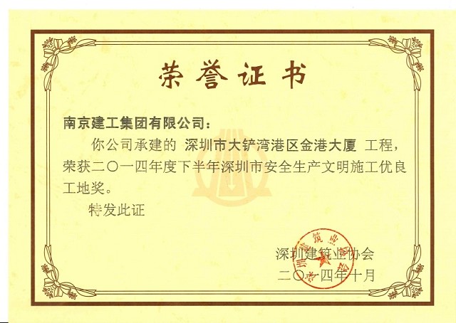 南京完美平台官网登录集团深圳金港大厦荣获深圳市安全生产文明施工优良工地奖日前,经深圳市建筑业协会组织专家组考评,由南京完美平台官网登录集团深圳分公司总承包的“大铲湾金港大厦工程”荣获2014年度下半年深圳市安全生产文明施工优良工地奖。