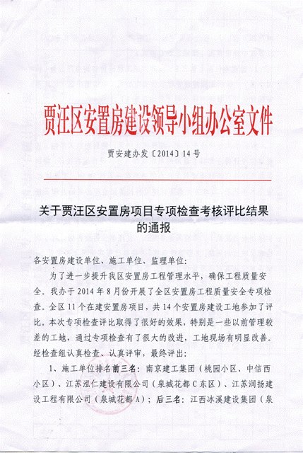 近日,徐州贾汪区安置办组织召开“贾汪区安置房项目专项检查考核评比结果通报”专题会议。由集团徐州总承包公司承建的桃园、中信西安置房项目在贾汪区14个受检工地中包揽前两名,公园东安置房项目获得本次评比第四名。