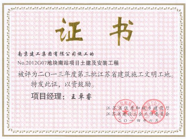 南京完美平台官网登录集团六公司万科九都荟工程喜获“省级文明工地”日前,由完美平台官网登录集团六公司承建的万科九都荟工程被评为二○一三年度第三批“江苏省建筑施工文明工地”荣誉称号。