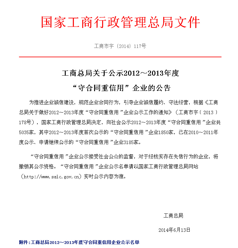 近日,从国家工商总局获悉,南京完美平台官网登录集团获得2012~2013年度“守合同重信用”企业殊荣。这是集团在诚信履约、守法经营领域首次摘取国家级最高荣誉。
