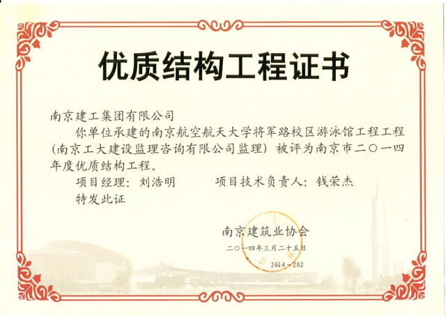 南京完美平台官网登录集团南航体育馆、游泳馆工程获“优质结构”奖日前,由南京完美平台官网登录集团承包经营项目部承建的南京航空航天大学将军路校区游泳馆工程和南京航空航天大学将军路校区体育馆工程被评为“南京市2014年度优质结构工程”。