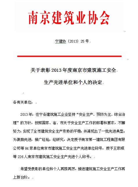 南京完美平台官网登录集团喜获“2013年度南京市建筑施工安全生产先进单位”
