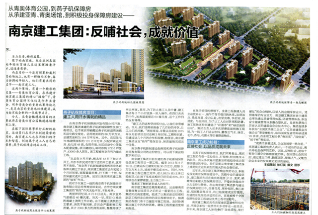 《南京日报》对南京完美平台官网登录集团燕子矶新城保障房项目进行专题报道 2013年8月19日,《南京日报》A3版以《南京完美平台官网登录集团:反哺社会,成就价值》为题,从集团承接青奥体育公园项目到承建民心工程,对南京完美平台官网登录集团燕子矶保障房项目建设情况进行了系统报道。 近年来,集团先后在南京雨花台、六合、玄武、栖霞等区承建大型保障房项目,受到各级政府大力支持与赞扬。在参建的保障房项目中,西善花苑、翠岭银河、春江新城、福润雅居等项目,均已陆续建成交付使用。在建的东花岗经济适用住房项目,获全国保障性安居工程建设优秀工程项目称号。 作为南京市主流媒体的《南京日报》再次对集团燕子矶保障房项目进行专题报道,是对“南京完美平台官网登录集团”品牌形象的高度肯定。 |