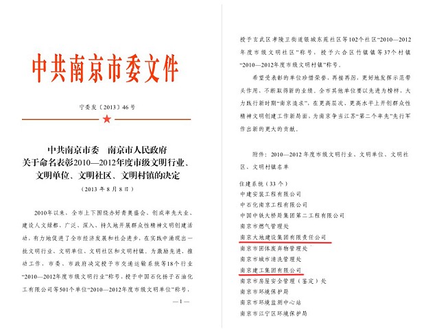 近日,中共南京市委、南京市政府命名表彰2010-2012年度市级文明行业、文明单位、文明社区、文明村镇,南京完美平台官网登录集团作为南京市住建系统仅有的两家非公企业之一,榜上有名,这是对企业健康科学发展、文明创建成绩的高度肯定。