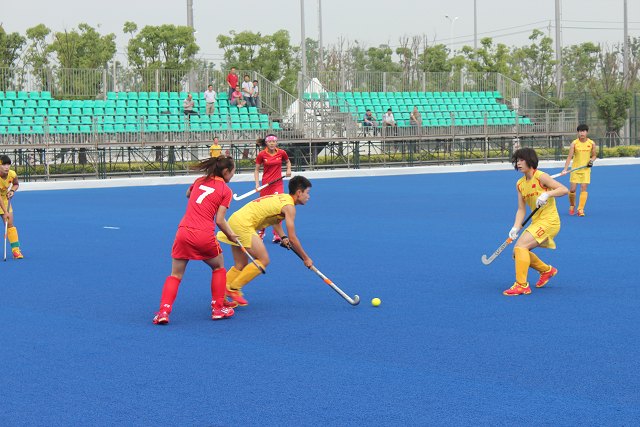测试赛结束后,淮安女子曲棍球队主教练孔庆杰表示,“为了与国际接轨,赛场颜色及比赛用球都进行了调整,运动员还有个适应的过程。建设方能在这么短的时间内建造出这么好的球场,功不可没。” |