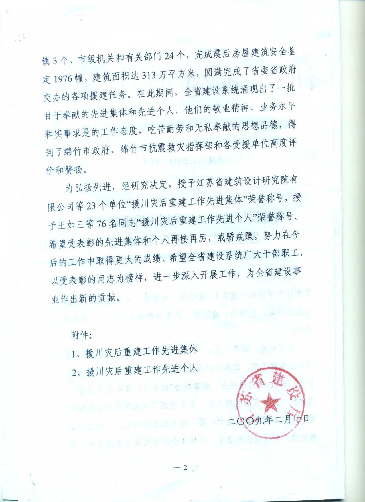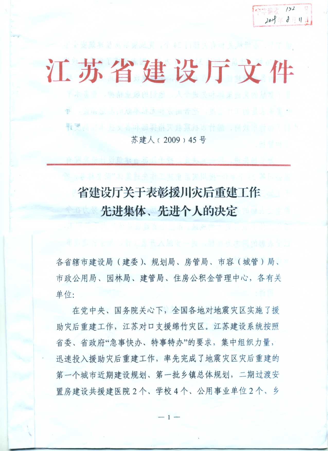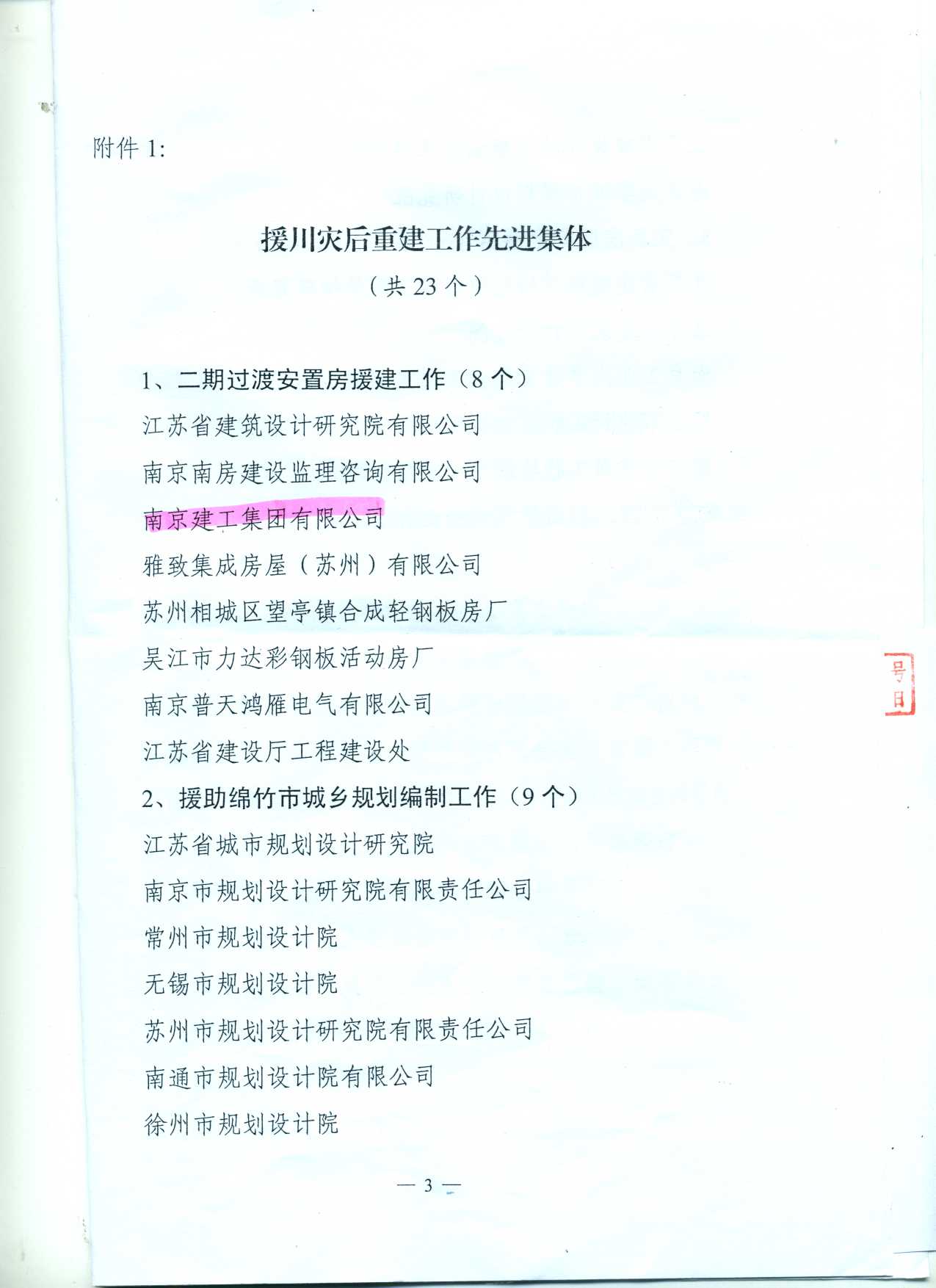 南京完美平台官网登录集团被评为江苏省建设厅“援川灾后重完美平台官网登录作先进集体”