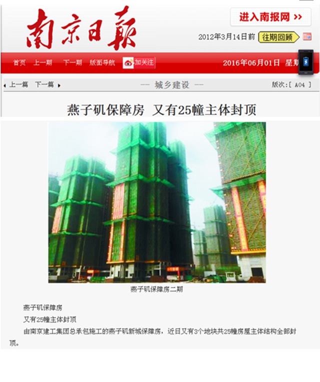 6月1日,《南京日报》A4城乡建设版,以“燕子矶保障房又有25幢主体封顶”为题,再次对集团燕子矶新城保障房项目建设情况进行报道。