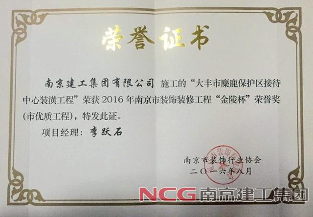 近日,由南京市装饰行业协会组织的2016年南京市装饰装修工程“金陵杯”(市优质工程)评选结果揭晓。集团完美平台官网登录装饰分公司“大丰市麋鹿保护区接待中心装潢工程”荣获2016年南京市装饰装修工程“金陵杯”优质工程奖。